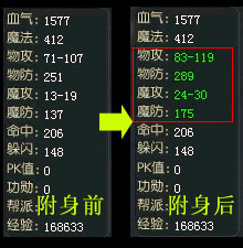 从合体的加成中究竟能获得多少属性值,除了和附体者的影武者技能值有关,还直接和合体双方的修炼度有关。双方的修炼度越高,也就是双方的影武者等级越高,所加的属性值能追加到被附体者身上的也越多。受影武者加成所影响的属性会以绿色状态显示,加成带来的变化可以一目了然了。