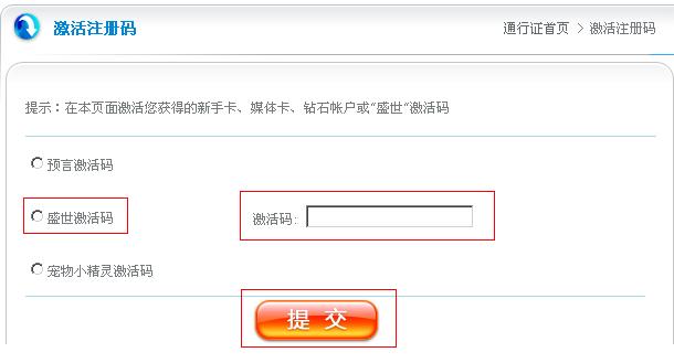 选择激活码的类型为盛世Online激活码,输入激活码,最后按提交即可。