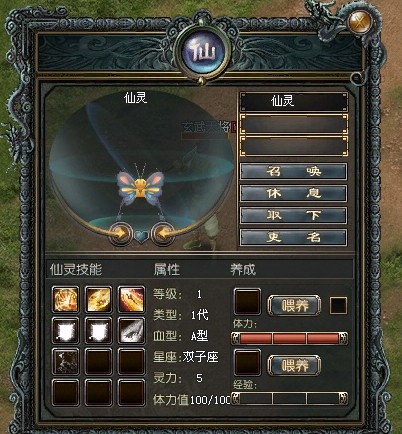 仙灵出现在界面中了,在这个界面里可以进行召唤、喂养等功能。