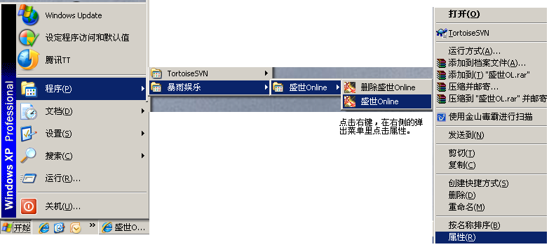 B. 点击开始——程序——苏州澳盛——盛世Online——《盛世Online》——属性——将下载包的文件解压到此目录(如图)