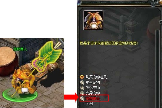 1. 在都城内找到NPC——宠物商人(479.387)。与其对话,在弹出的对话框内,选择“宠物融合”一项。