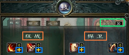 每个职业有两个系的技能,比如武圣有狂战和捍卫两个系(下图桔色框)。当本系技能加到一定点数,则开启下一层的技能。>>>>>>点击查看学习技能