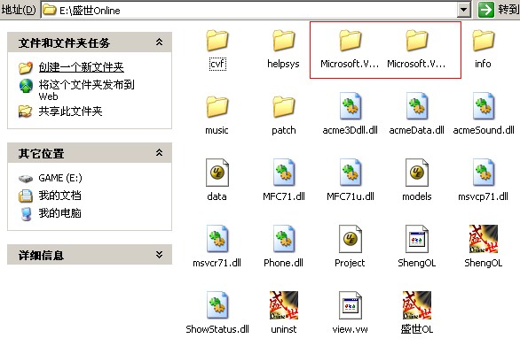 3、将解压出的两个文件夹:Microsoft.VC80.CRT和Microsoft.VC80.MFC复制到盛世Online安装文件夹下。(如下图)