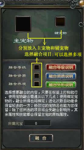 1. 在都城内找到NPC——宠物商人(479.387)。与其对话,在弹出的对话框内,选择“宠物融合”一项。