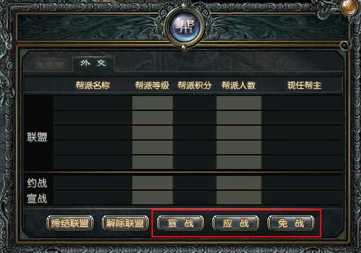 帮派的帮主和护法在本帮被宣战后5分钟内可在“外交”标签内选择本帮应战或免战。应战,即两个帮派开始进入帮战状态;而免战则为拒绝对方的宣战,免战本身需要消耗双倍于宣战金额的帮派资金。超过时限未做任何操作,则默认为自动应战。