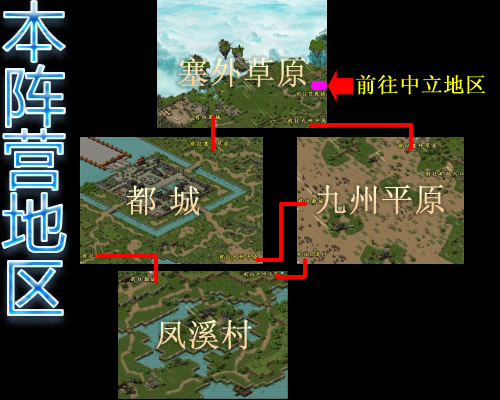 本阵营的地区范围将缩小,只包含都城、凤溪村、九州平原和塞外草原这4个区域。本阵营地区的缩小,使得初级阶段的任务路线更短,同时组队杀怪也更容易。