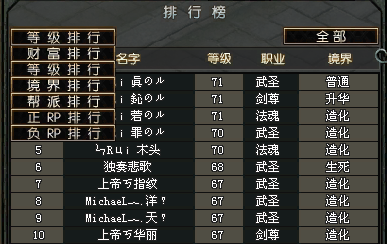 点击上图的“等级排行”,则可以查看诸如财富、境界等其他方面的排行。