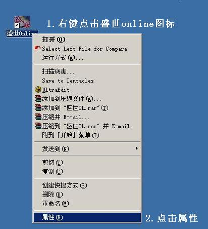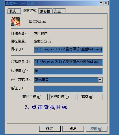 A.右键点击《盛世Online》图标——属性——点击查找目标——将下载包的文件解压到此目录。(如图)