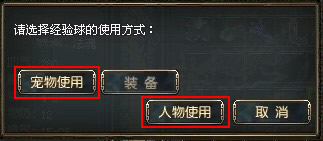 再打开背包(B),右键点击小经验球,就会看到与装备时相同的界面。但这时候选择“宠物使用”或“人物使用”,就会把里面的经验加给宠物或角色自身。