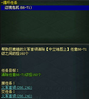 该任务根据玩家自身等级来分配相应等级的任务,任务等级分为30-35级,36-40级,41-45级,46-50级,51-55级,56-60级,61-65级以及66-70级。
