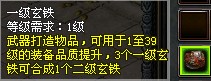 再看兑换后的一级玄铁显示的内容是:可用于1到39级的装备品质提升,以及可以合成二级玄铁。