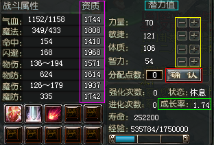 资质和和成长率是宠物的天生属性,资质反映了宠物各方面的能力,成长率越高宠物属性值增长越多,这些天生属性可以通过宠物重生进行改变。在都城的宠物管理员(479,387)处可以进行宠物的进化、变异和重生。