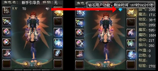 在角色界面(按C键),角色形象右上角有个钻石图标。非钻石用户状态为灰色,成为钻石用户后会点亮成蓝色,鼠标悬停在上面会显示钻石用户剩余时长。离线状态钻石用户依然计时。