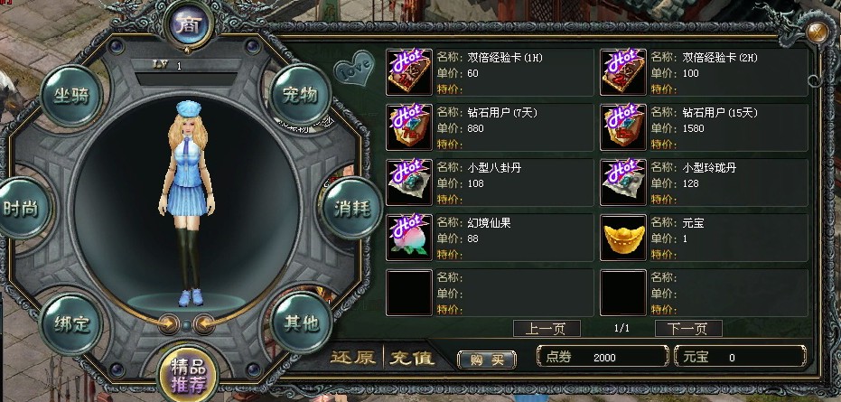 《盛世Online》充值功能已经开启,玩家充值成功后即获得相应数量的点券。人民币和点券的兑换比例为1:100。您可以使用点券在游戏的商城内直接购买道具。也可以在商城内用点券购买元宝,购买比例为1:1。元宝不仅可以在商城内购买道具,还可以用于和玩家进行交易。